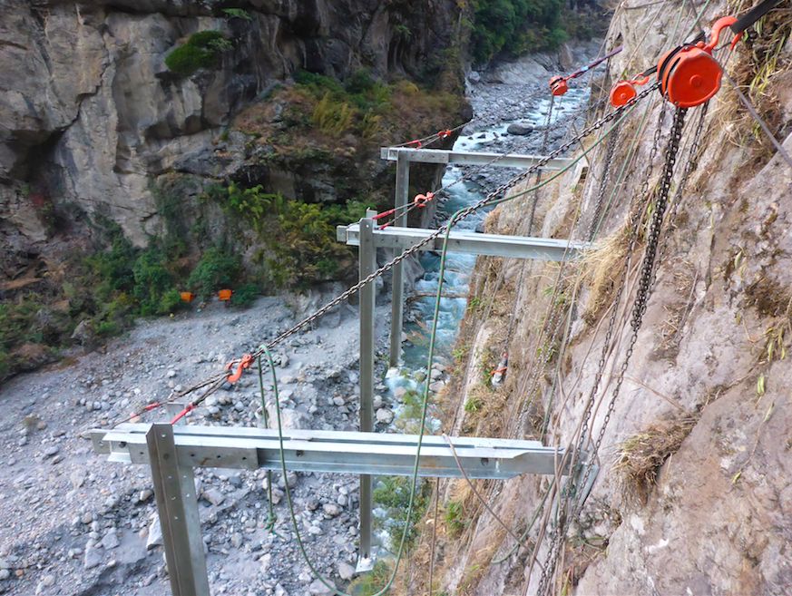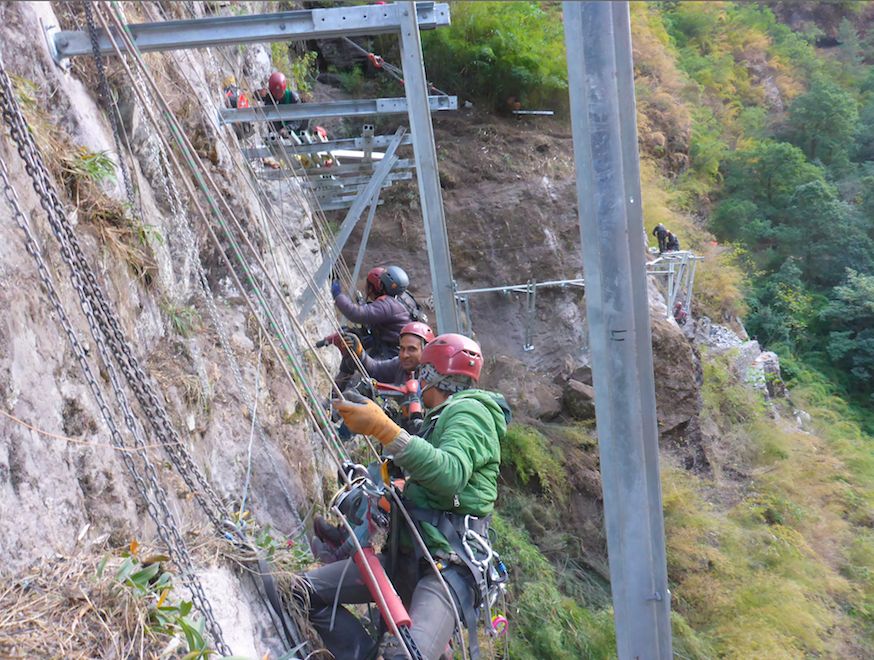 The cantilever bridge has been finalised in 2015. It is again possible to walk all the way up to the Upper Gorkha district, on foot or with mules, for the first time since the earthquake struck Nepal in April 2015. This is a relief for the local people and also the trekkers that can now reach Manaslu Conservation Area safely. This work was financed by DfID and implemented by AF-ITECO. DROPSTONE provided advisory support for the geological feasibility study.